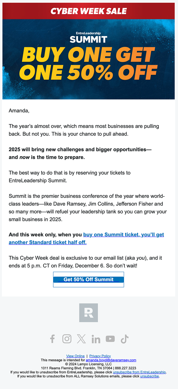 From rewriting its main landing page to drafting lead generating email campaigns, I was the primary copywriter on most marketing assets for EntreLeadership Summit between 2022 and 2025.